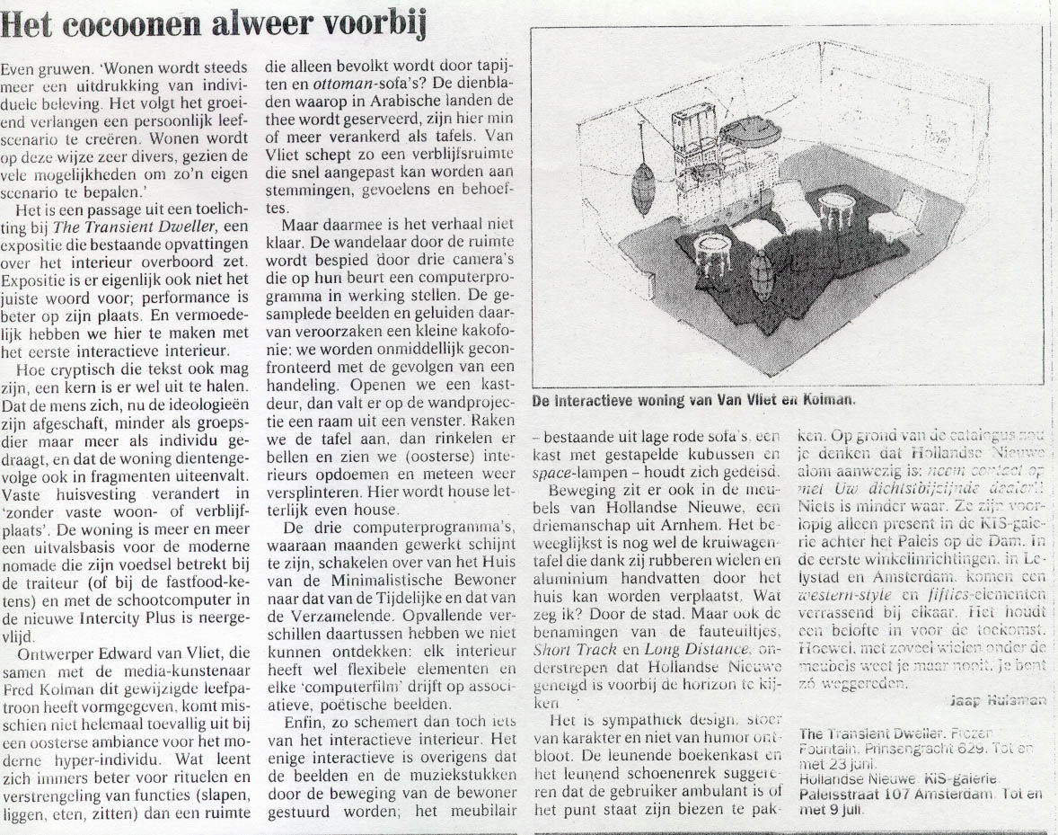 "Expositie is er eigenlijk ook niet het juiste woord voor; performance is beter op zijn plaats. En vermoedelijk hebben we hier te maken met het eerste interactieve interieur."